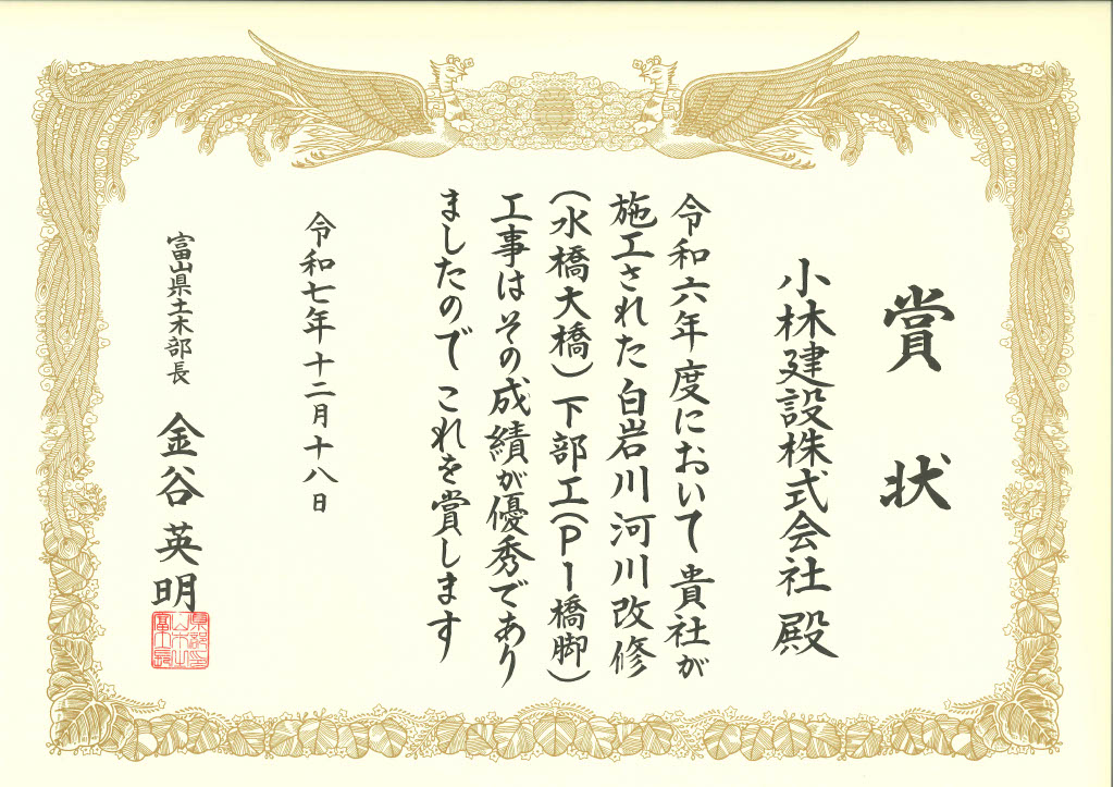 この度、当社施工の白岩川河川改修(水橋大橋)下部工(P1橋脚)工事が 令和7年度 富山県建設優良工事表彰【土木部長賞】を受賞いたしました。 当工事は河川内での工事ということで、出水期等により施工できる...